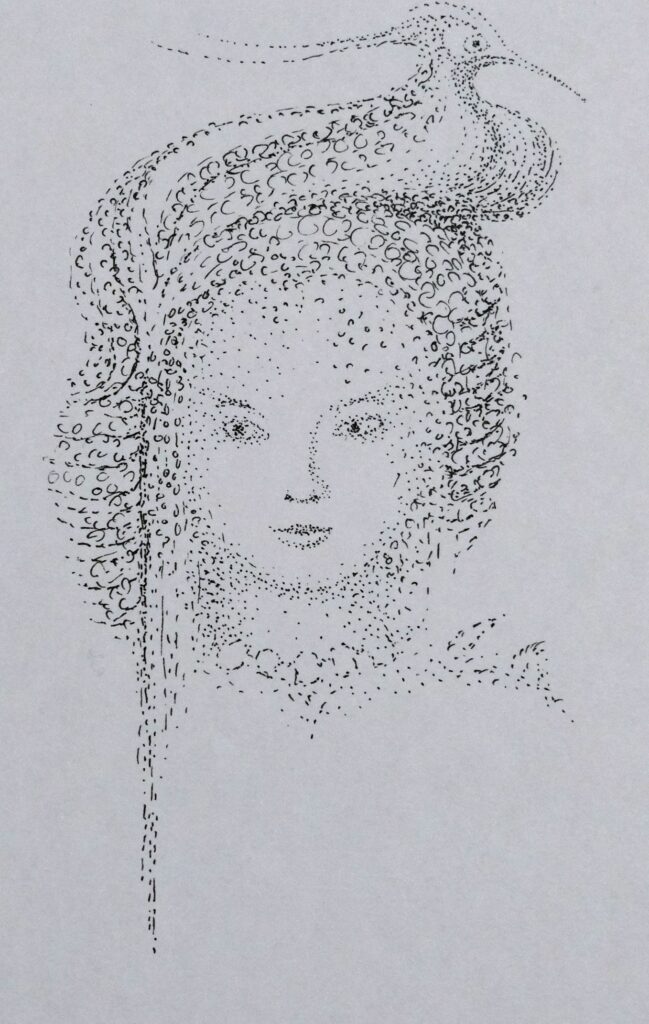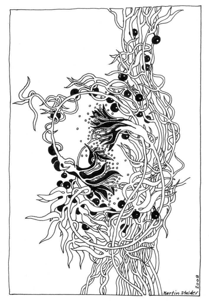 Drawings to unfold the image move your cursor over the image „Eye“, color pen „Decorated lady“, ink „Time to celebrate“, 1986, ink „Physalis“, ink „Playful forms“, ink „Time to celebrate“, 2008, ink „Bougainvillea“, 2012, ink